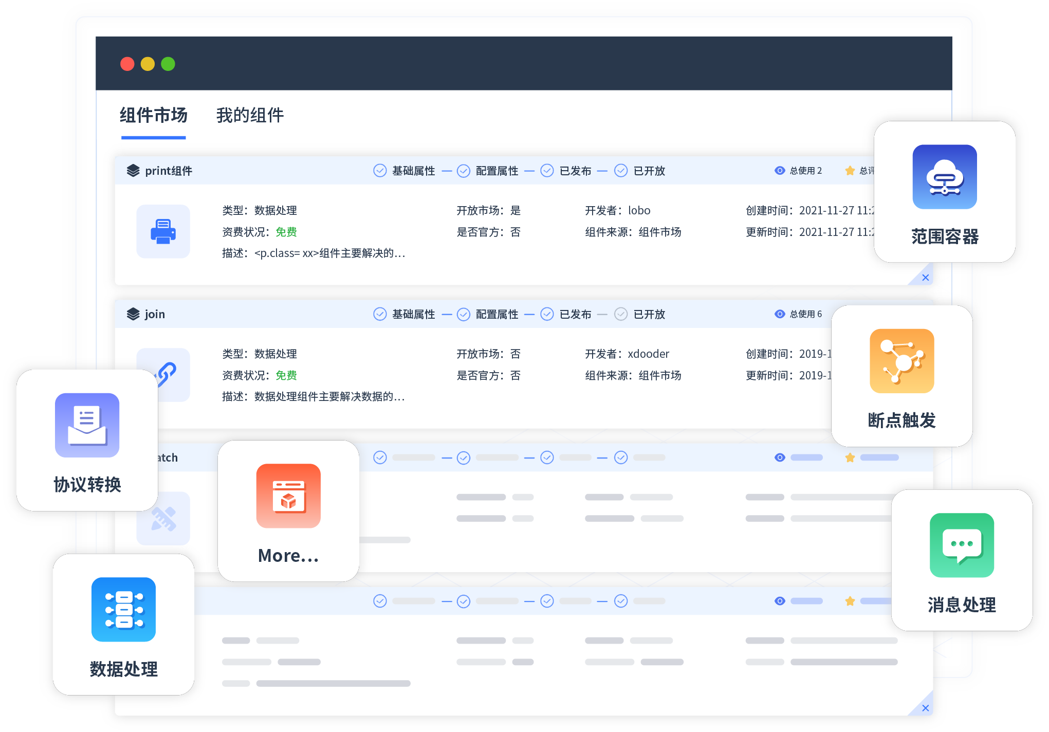 针对集成场景,,CGPAY钱包提供组件市场,,,,例如协议转换、、、、消息处理、、、、文件操作等。。。除平台提供的组件外,,客户可以自定义所需组件。。。