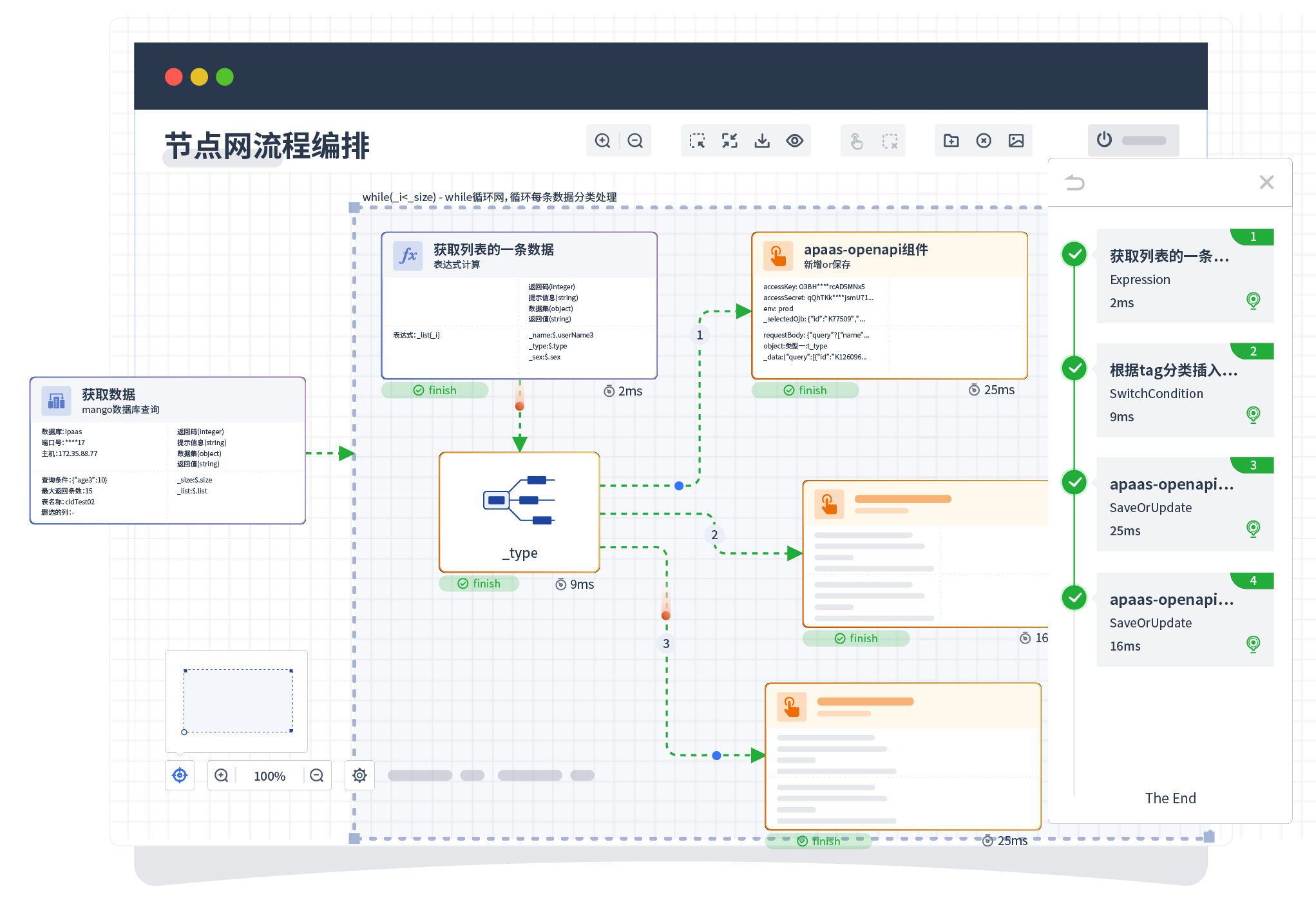 针对集成场景,,,组件定义后支持进行流程编制,,,不同于传统代码方式,,,,通过图形化展示,,,支持在线调试、、、、日志查看和运行回放。。。。