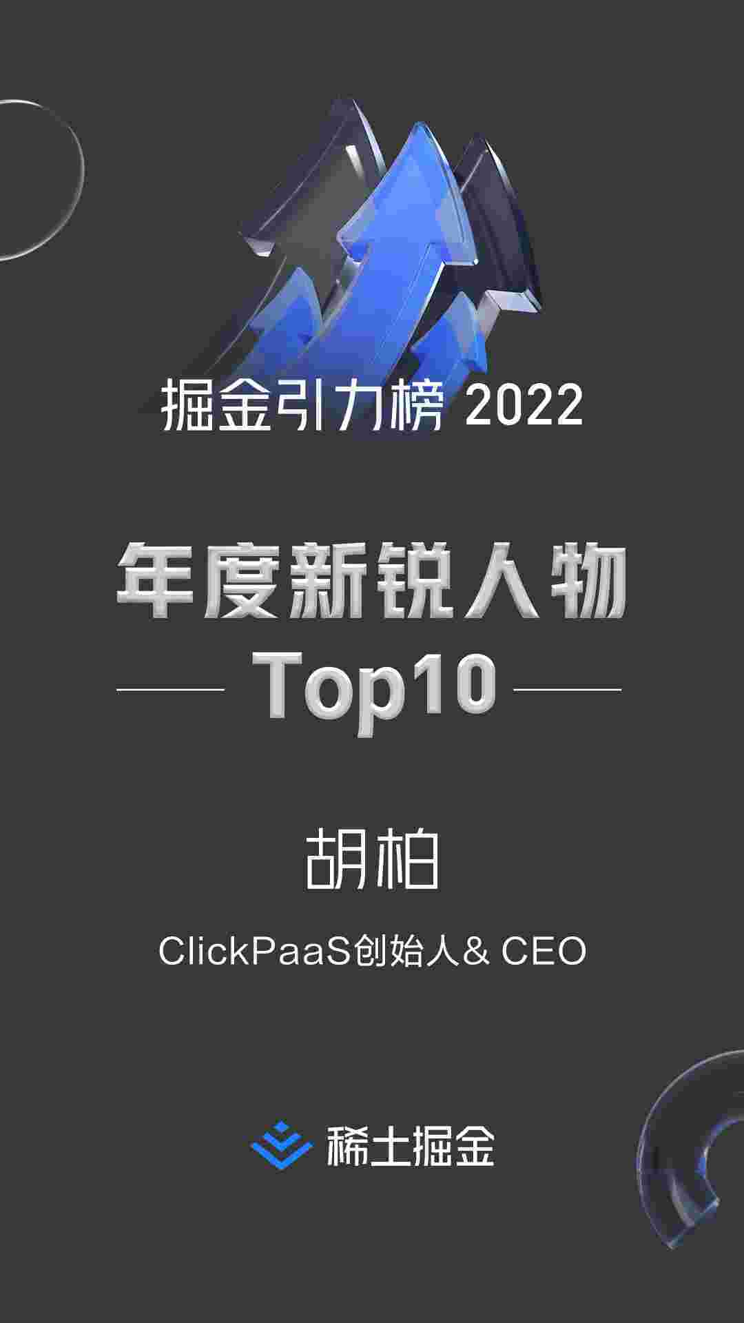 2022年1月6日,,,稀土掘金社区第一届「掘金未来大会」成功举办,,会上发布了“2022 稀土掘金引力榜 年度新锐人物”榜单,,,上海爱湃斯科技有限公司(简称CGPAY钱包)创始人及CEO胡柏实力入选年度新锐人物TOP 10。。。。